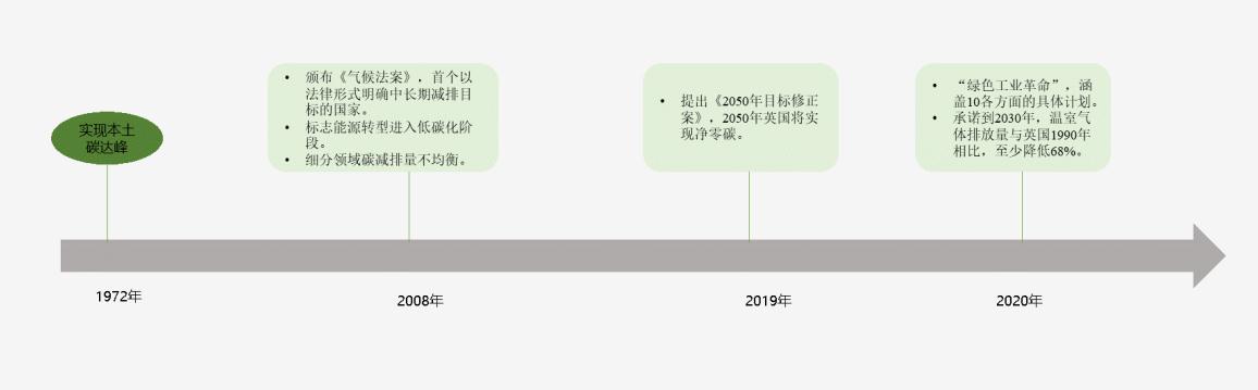 報告圍繞中國應(yīng)對氣候變化的政策措施、歐美日主要國家的典型做法、中國“碳達峰、碳中和”現(xiàn)狀及實施路徑等方面進行深度分析,重點在電力行業(yè)、工業(yè)行業(yè)、交通運輸行業(yè)、建筑行業(yè)展開專題研究,共同探討各地方政府實現(xiàn)“雙碳”目標(biāo)的行動方案,以期為地方政府決策及業(yè)界參考提供智力支撐,助力我國“碳達峰、碳中和”目標(biāo)的實現(xiàn)。 1.碳達峰發(fā)展階段 在應(yīng)對全球氣候變化、實現(xiàn)碳中和目標(biāo)上,英國通過一系列的承諾和改革舉措,在該領(lǐng)域保持世界領(lǐng)先地位。 英國早在1972年就已經(jīng)實現(xiàn)本土碳達峰,2008年正式頒布《氣候變化法》,確定了到2050年將溫室氣體排放量比1990年減少80%的長期減排目標(biāo),成為世界上首個以法律形式明確中長期減排目標(biāo)的國家。在法案通過后的10年間,英國溫室氣體減排初具成效,2018年比2008年下降了30%。 2019年6月,英國提出了《2050年目標(biāo)修正案》,正式確立到2050年實現(xiàn)溫室氣體“凈零排放”。 2020年11月宣布一項涵蓋10個方面的“綠色工業(yè)革命”計劃,包括大力發(fā)展海上風(fēng)能、推進新一代核能研發(fā)和加速推廣電動車等。 2020年12月宣布最新減排目標(biāo),承諾到2030年英國溫室氣體排放量與1990年相比,至少降低68%。