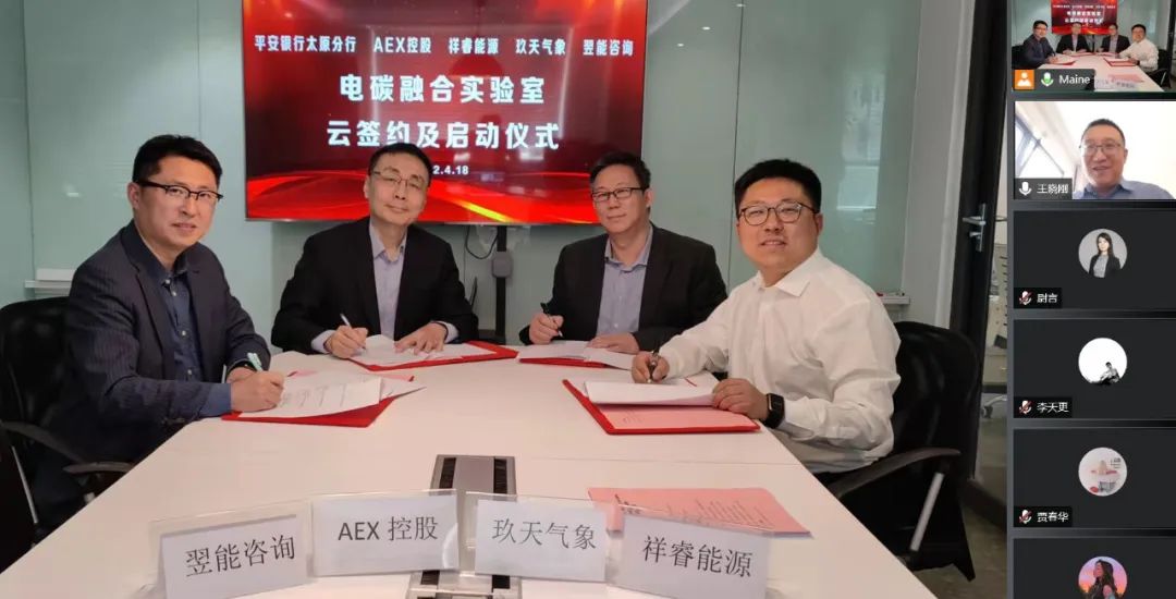 4月18日,祥睿能源與平安銀行、AEX控股、玖天氣象、翌能咨詢舉行了“電碳融合實驗室”線上云簽約暨啟動儀式。平安銀行太原分行行長王曉剛、AEX控股有限公司總經理黃杰夫、北京玖天氣象科技有限公司總經理黃俊、翌能(北京)咨詢有限公司總經理鄭鵬程、山西祥睿能源有限公司董事長王正通等出席。
