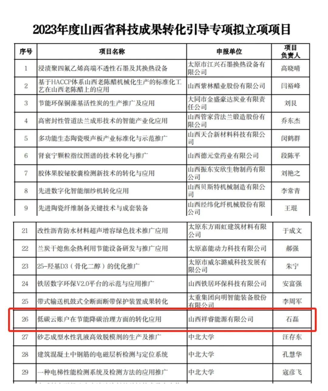 | 祥睿能源在節(jié)能降碳領(lǐng)域的創(chuàng)新突破:低碳云賬戶和碳計量分獲省科技廳科技成果轉(zhuǎn)化與研發(fā)支持計劃 |