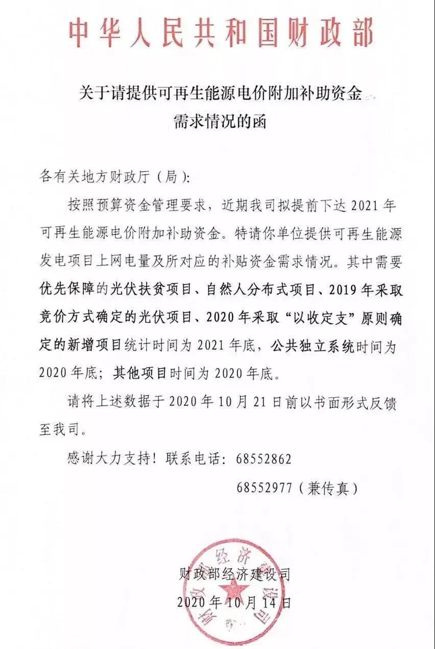 | 財(cái)政部擬下發(fā)2021年可再生能源電價(jià)附加補(bǔ)助資金 10月21日前申報(bào) |
