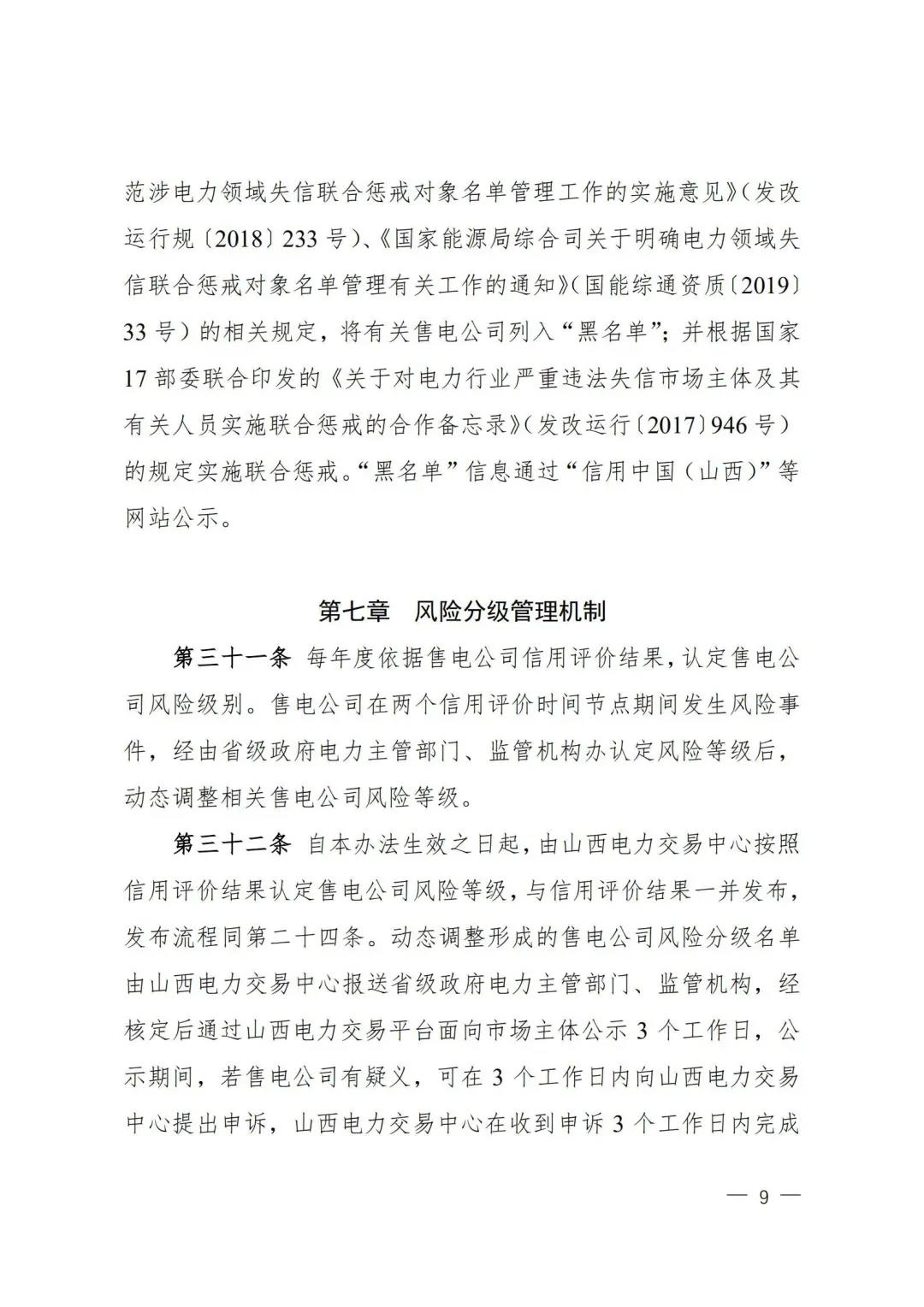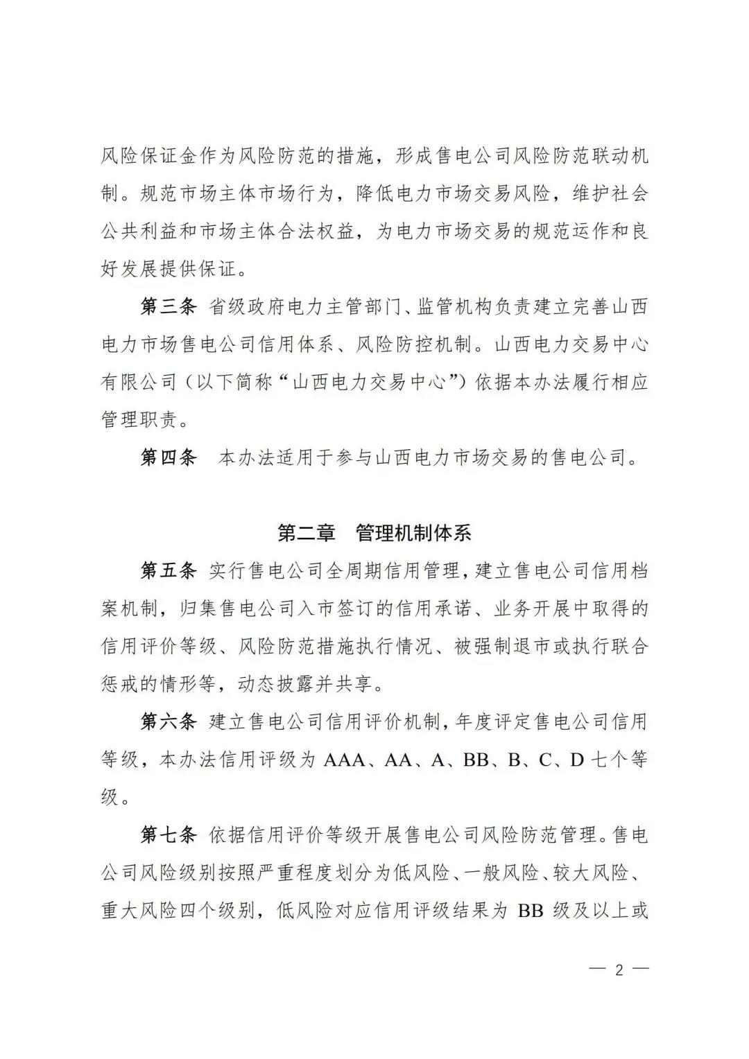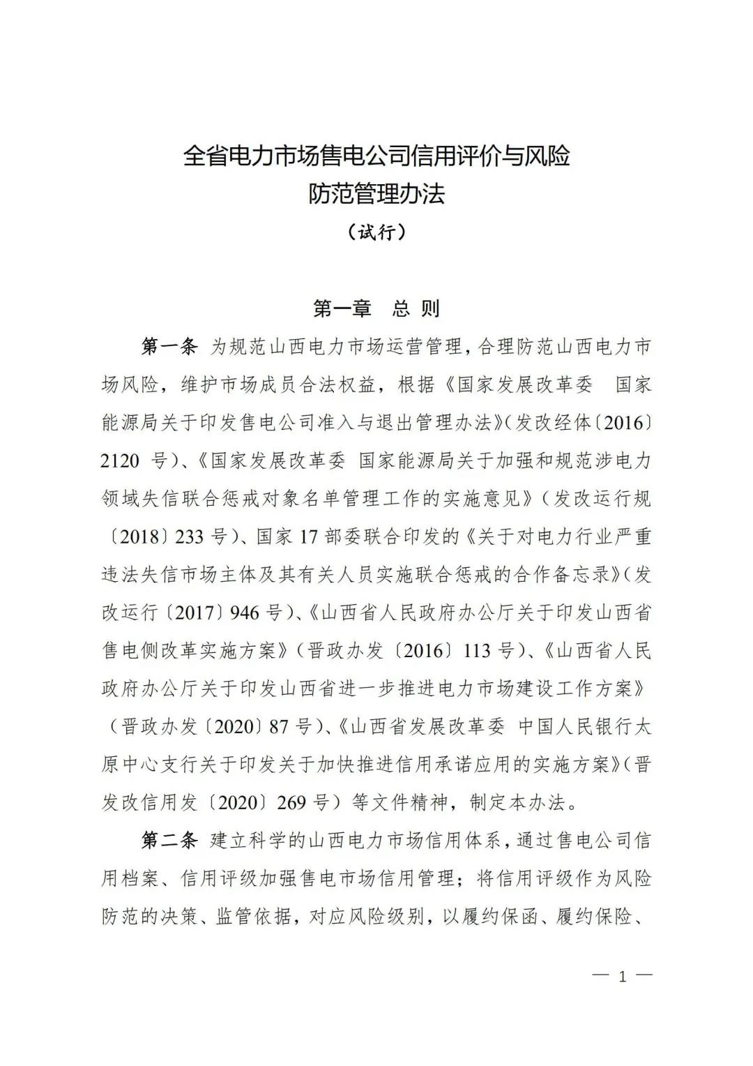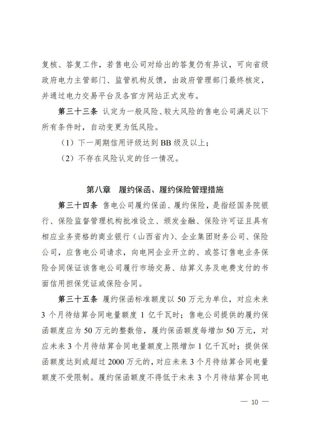 | 山西電力市場(chǎng)售電公司信用評(píng)價(jià)與風(fēng)險(xiǎn)防范管理辦法:依據(jù)風(fēng)險(xiǎn)級(jí)別執(zhí)行履約保函、保險(xiǎn)或風(fēng)險(xiǎn)保證金措施 |