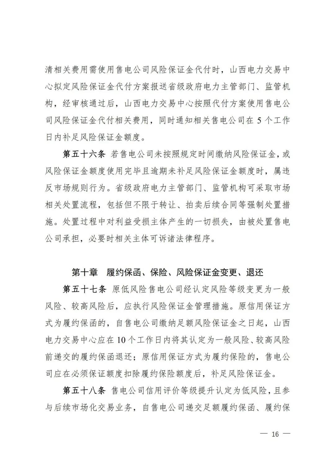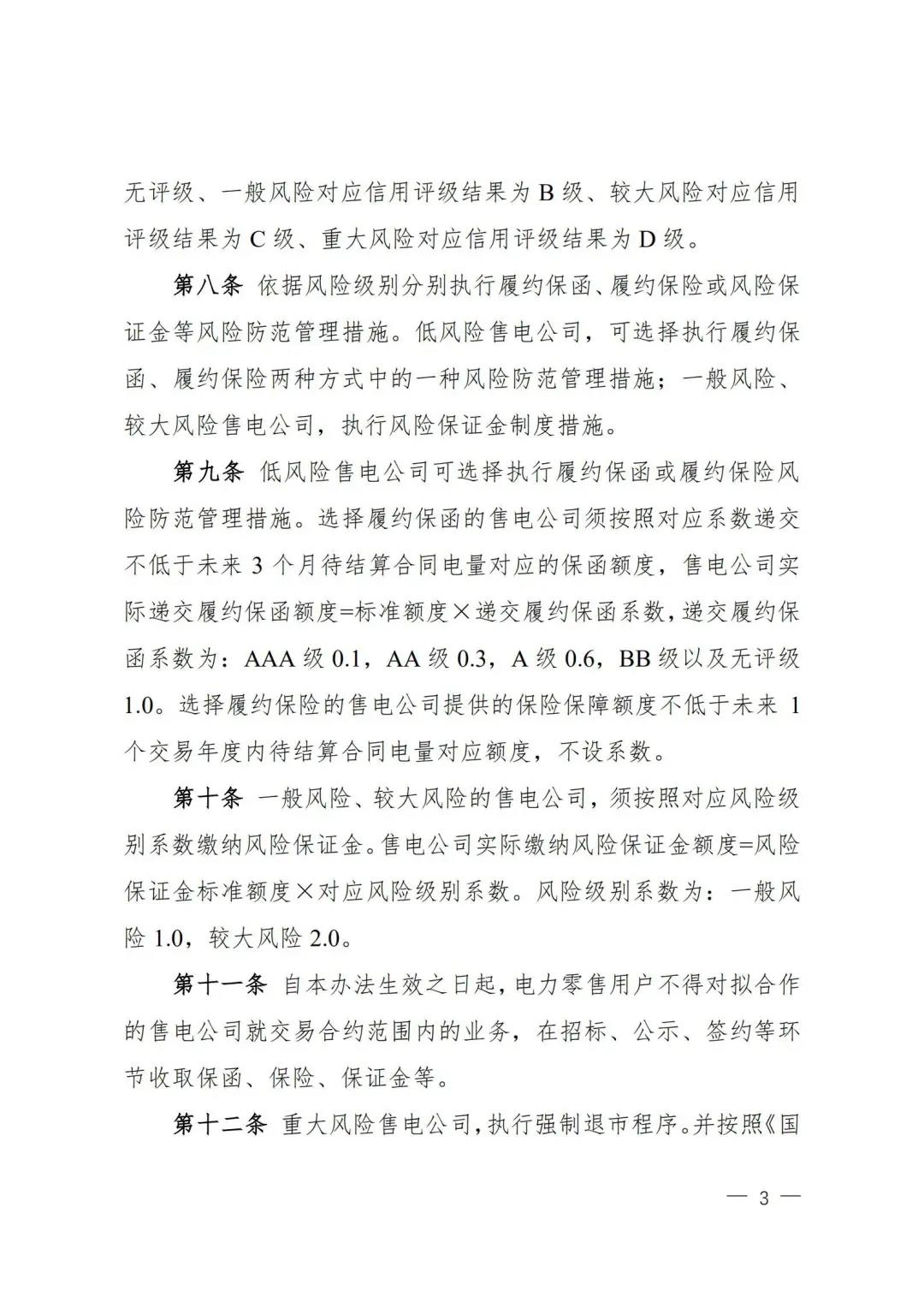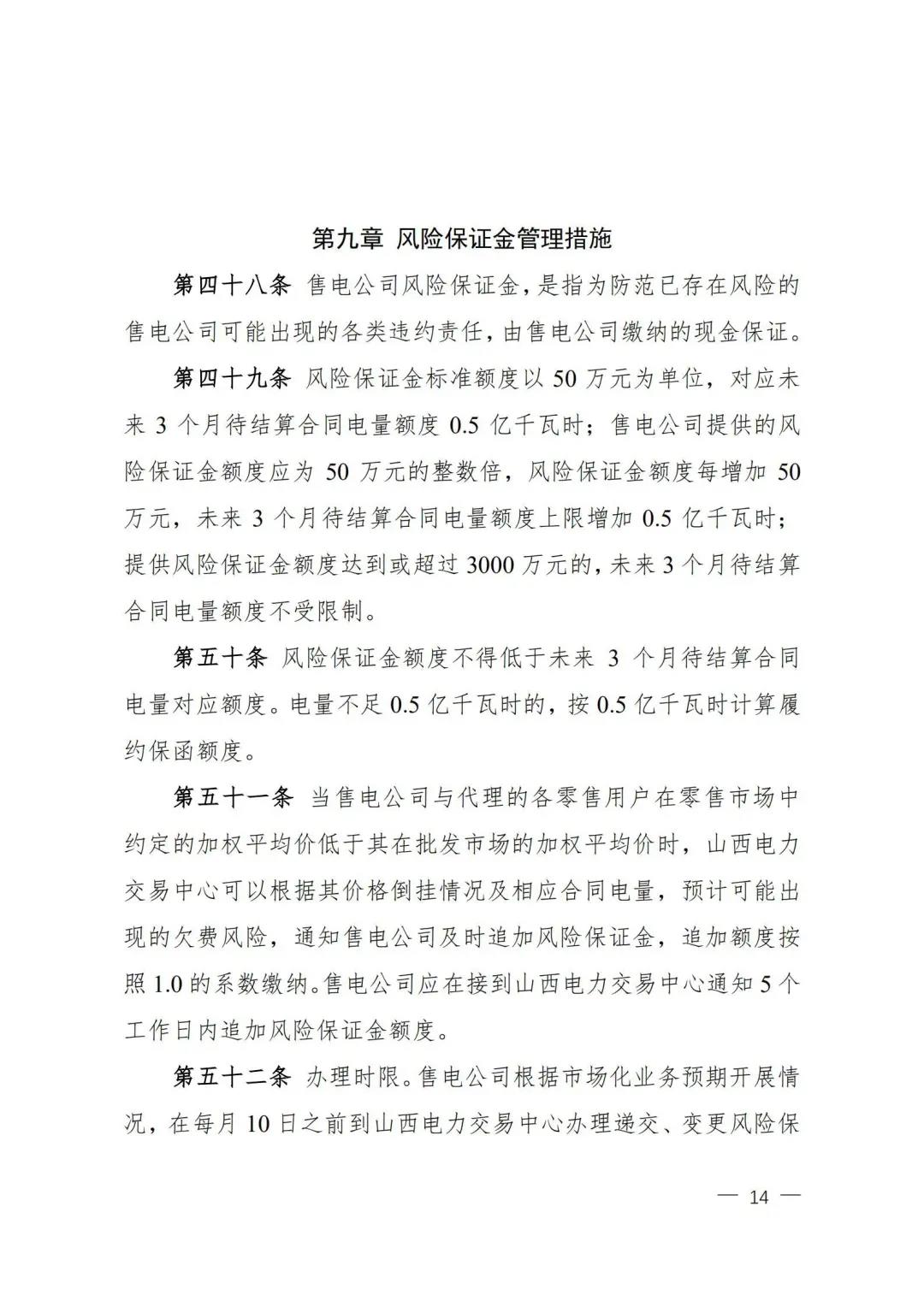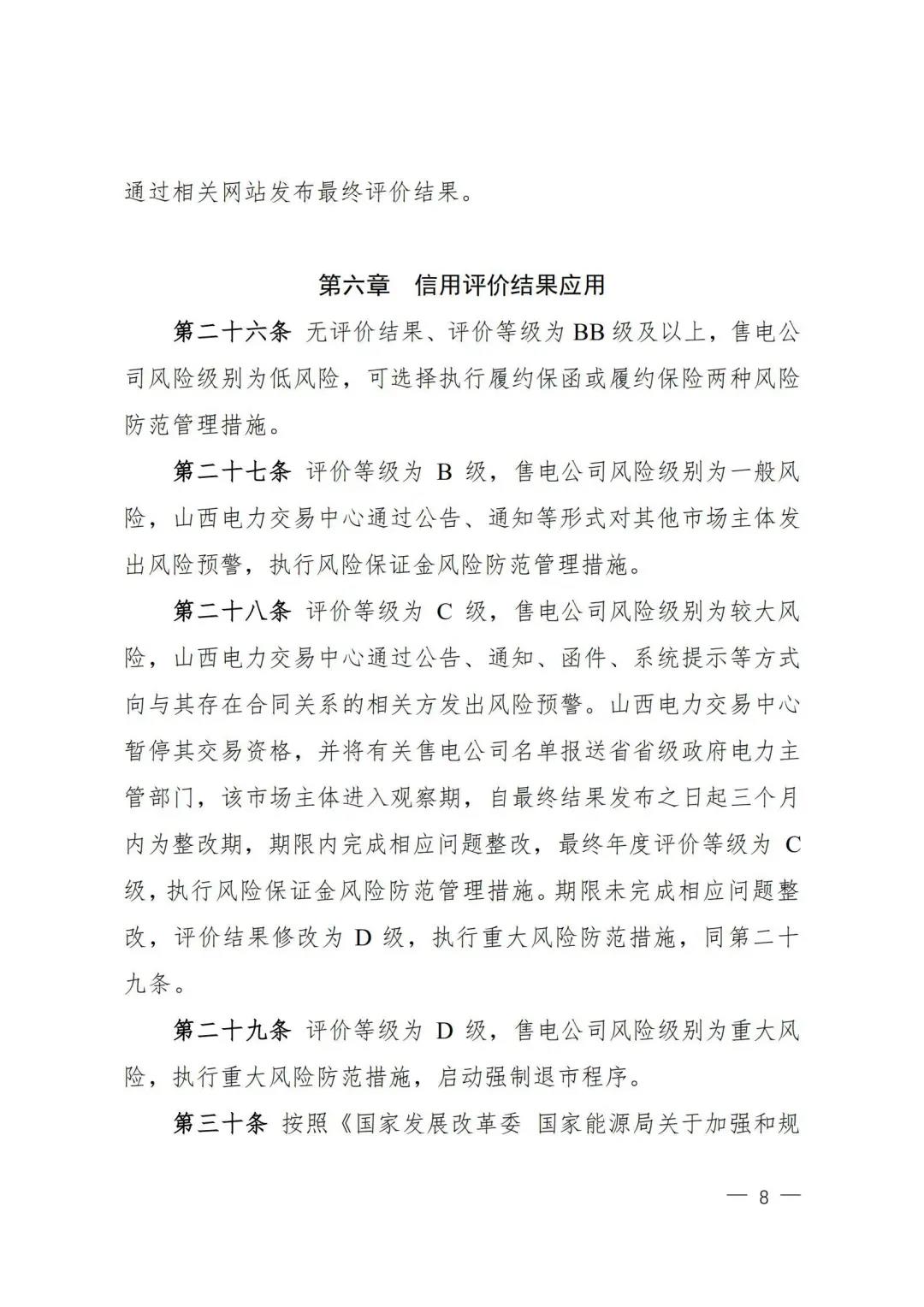 | 山西電力市場(chǎng)售電公司信用評(píng)價(jià)與風(fēng)險(xiǎn)防范管理辦法:依據(jù)風(fēng)險(xiǎn)級(jí)別執(zhí)行履約保函、保險(xiǎn)或風(fēng)險(xiǎn)保證金措施 |