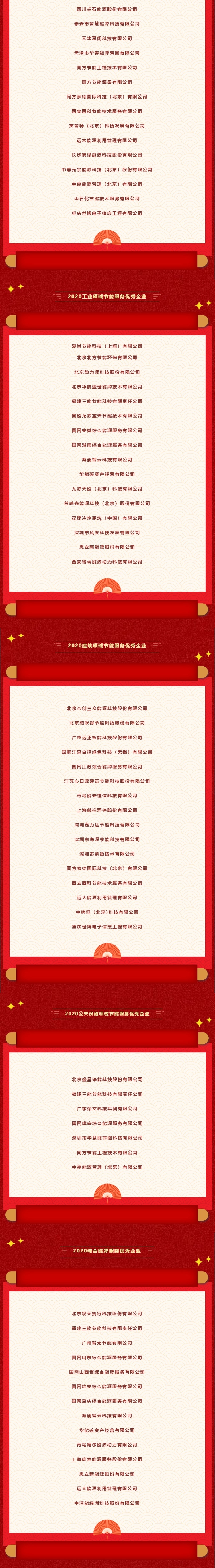 授予安徽省安泰科技股份有限公司等31家單位為“2020節(jié)能服務(wù)產(chǎn)業(yè)品牌企業(yè)”榮譽稱號; 授予鞍鋼集團節(jié)能技術(shù)服務(wù)有限公司等12家單位為“2020節(jié)能服務(wù)產(chǎn)業(yè)最具成長性企業(yè)”榮譽稱號; 授予阿里斯頓熱能產(chǎn)品(中國)有限公司(ELCO)等15家單位為“2020節(jié)能服務(wù)產(chǎn)業(yè)創(chuàng)新企業(yè)”榮譽稱號;授予愛景節(jié)能科技(上海)有限公司等61家單位為“2020節(jié)能服務(wù)產(chǎn)業(yè)重合同守信用企業(yè)”榮譽稱號; 授予北京北方節(jié)能環(huán)保有限公司等16家單位為“2020工業(yè)領(lǐng)域節(jié)能服務(wù)優(yōu)秀企業(yè)”榮譽稱號; 授予國聯(lián)江森自控綠色科技(無錫)有限公司等16家單位為“2020建筑領(lǐng)域節(jié)能服務(wù)優(yōu)秀企業(yè)”榮譽稱號; 授予同方節(jié)能工程技術(shù)有限公司等7家單位為“2020公共設(shè)施領(lǐng)域節(jié)能服務(wù)優(yōu)秀企業(yè)”榮譽稱號; 授予福建三能節(jié)能科技有限責(zé)任公司等14家單位為“2020綜合能源服務(wù)優(yōu)秀企業(yè)”榮譽稱號; 授予北京綠洲德瀚環(huán)境保護中心有限責(zé)任公司等17家單位為“2020清潔供熱服務(wù)優(yōu)秀企業(yè)”榮譽稱號; 授予中嘉能源管理(北京)有限公司等123家單位為“2020 EMCA優(yōu)秀會員單位”榮譽稱號; 授予海瀾智云科技有限公司“海瀾工業(yè)互聯(lián)網(wǎng)智慧云平臺·智慧系統(tǒng)節(jié)能技術(shù)”等12項技術(shù)為“2020優(yōu)秀節(jié)能與能效提升技術(shù)”榮譽稱號; 授予北京動力源科技股份有限公司實施的“河南能源化工集團鶴壁煤化工有限公司蒸汽階梯利用合同能源管理項目”等40個項目為“2020合同能源管理優(yōu)秀項目”榮譽稱號; 授予青島海爾能源動力有限公司總經(jīng)理-柴紀(jì)強等9人為“2020節(jié)能服務(wù)產(chǎn)業(yè)優(yōu)秀企業(yè)家”榮譽稱號; 授予國能龍源藍(lán)天節(jié)能技術(shù)有限公司黨委委員、副總經(jīng)理-陳振宇等57人為“2020節(jié)能服務(wù)產(chǎn)業(yè)先進工作者”榮譽稱號。